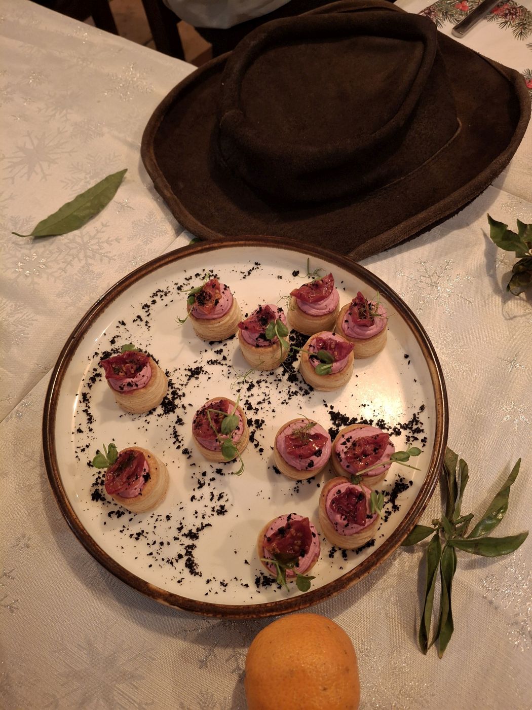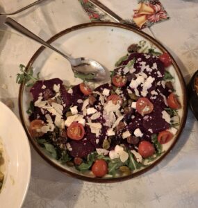Po barszczu wjeżdżały na stół kolejne dania, teoretycznie zgodne z tradycją, ale jednak proponowane w zupełnie inny, ciekawy sposób. Był dorsz podawany w zawiniętych torebkach, w ciekawym smacznym sosie, były artystyczne koreczki z twarożku z dodatkami, pasztet łososiowo-szpinakowy, sałatka z buraczków, fety i pomidorków koktajlowych, sałatka śledziowa i ryba po grecku, także trochę inne niż znamy. Był kompot, potem różne ciasta, herbata i kawa. Spożywaliśmy nieśpiesznie, gaworząc i delektując się świąteczną atmosferą. Hania tradycyjnie częstowała pierniczkami swojego wyrobu. Życzenia imieninowe złożono Ewie – kronikarce.