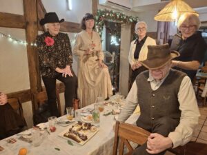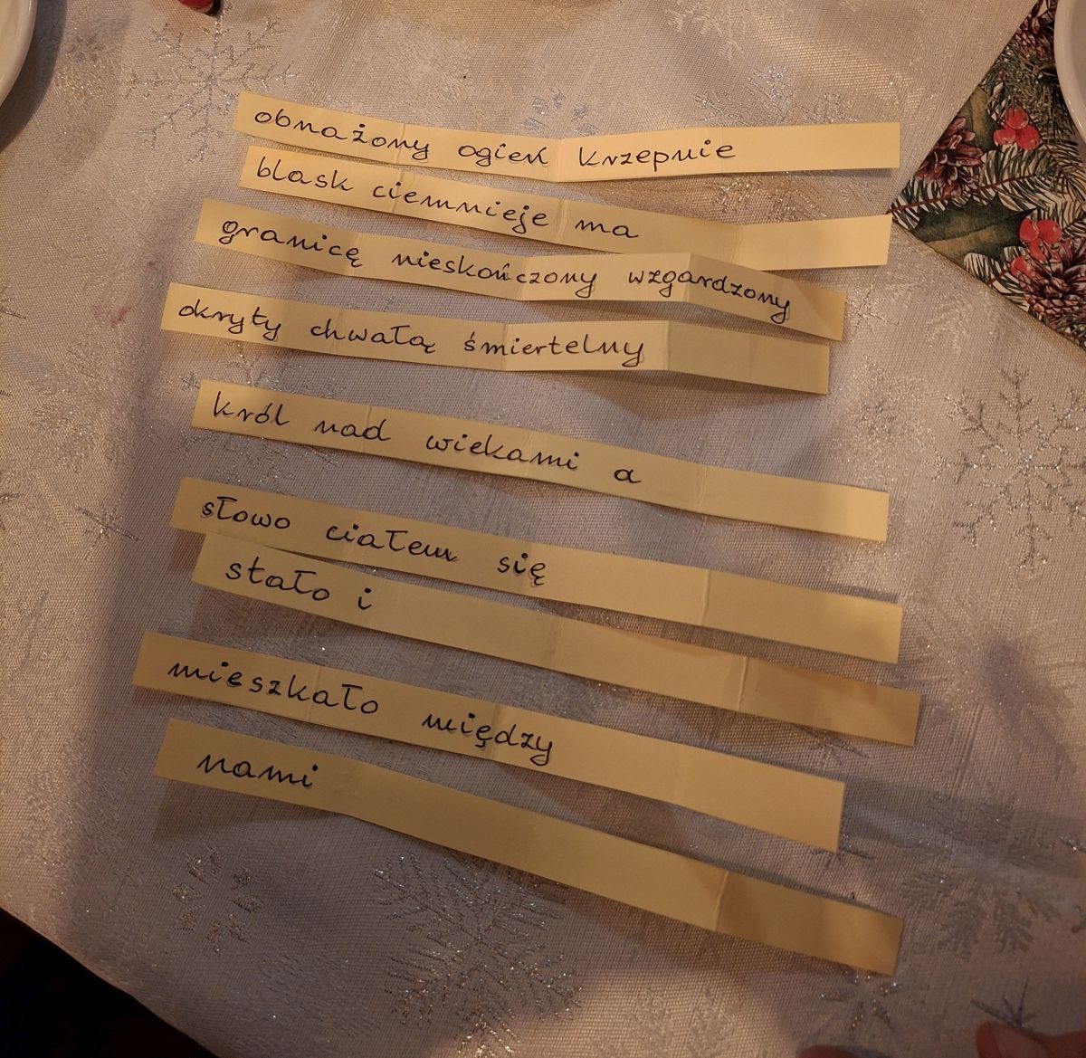 Towarzystwo się rozgrzało i po chwili zaproponowana została druga zabawa. Rozdane zostały wszystkim różowe i żółte zwitki papieru i padła komenda, aby ci z różowymi zebrali się w jednym kącie sali, a ci z żółtymi w drugim. Następnie należało porozwijać karteczki, na których widniały pozornie bezładne kawałki zdań i z tych zdań jak z puzzli sklecić logiczny tekst. Która grupa zrobi to pierwsza ma odśpiewać ukrytą w ten sposób piosenkę. Obie grupy rywalizowały zawzięcie i prawie równocześnie odkryły i odśpiewały swoje teksty. Jedną odkrytą w ten sposób piosenką było „Piękne życie spędzają kowboje”, drugą kolęda „Bóg się rodzi”. I ta zabawa była świetna, zaangażowanie obu grup było wielkie. Odśpiewaliśmy odkryte teksty z wielką werwą.